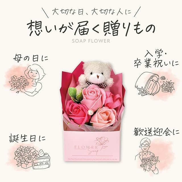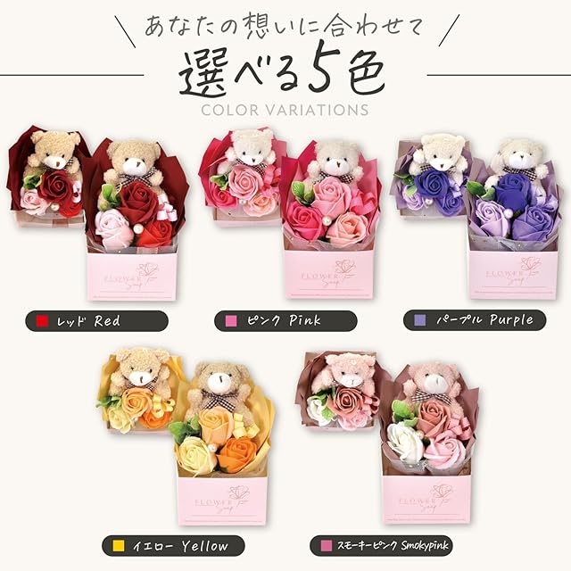 【様々なシーンに対応|贈る相手を選ばない万能ギフト】赤・ピンク・青・紫・黄色など豊富なカラーバリエーションで、母の日・敬老の日・父の日・誕生日・記念日・結婚祝い・出産祝い・退職・送別・お見舞い・発表会・開店祝いや新築祝いなど、幅広いシーンでご利用いただけます。還暦・古希・喜寿・米寿・金婚式・銀婚式などの長寿祝いにもおすすめ。くま付き花束やギフトボックス入りのソープフラワーも人気が高く、女性・男性問わず幅広い年代に喜ばれます。届いてすぐに渡せるラッピング仕様で、そのままプレゼントできるのも嬉しいポイントです。