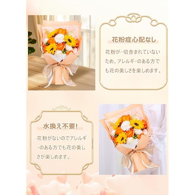 【長く楽しめるインテリアとしても人気】 ソープ素材の造花は水やり不要で、お手入れも簡単。季節を問わず長く美しさを保ち、玄関、リビング、寝室などにやさしい彩りを添えます。自宅用としても好評です。"
