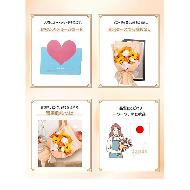 【ひまわりの明るさで気持ちが伝わるギフト】 ソープフラワーに鮮やかなひまわりを加えた花束は、母の日や誕生日、退職祝いなど、感謝の気持ちを明るく届けたい場面にぴったりの贈り物です。