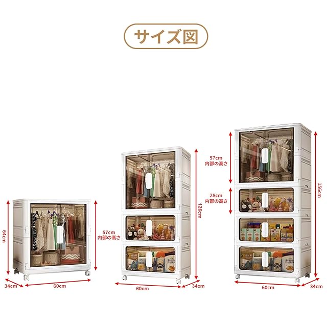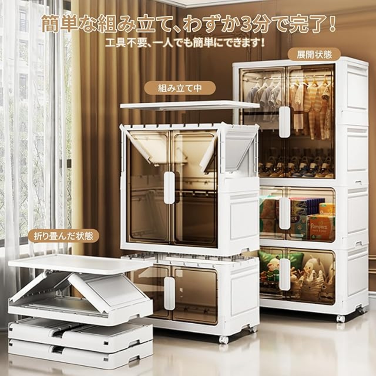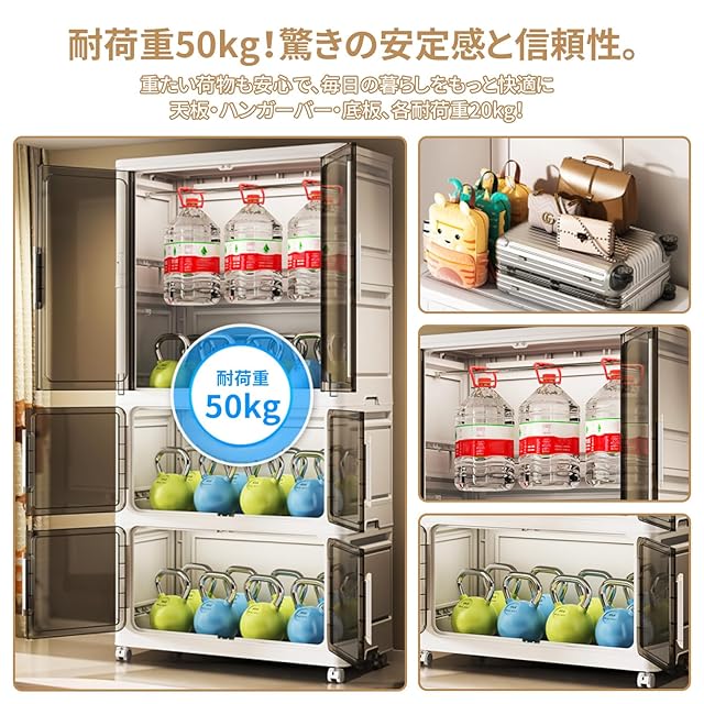 【抜群の収納力&高耐荷重】衣類だけではなく、他のアイテムもガンガン収納できます!1つのボックスで色々使えるから、お部屋もスッキリ整って、気分も爽快!家の中がもっと広く感じられて、使うたびに楽しくなります!本体は高品質なPPを採用し、高い靭性、耐磨耗・引き裂きに強く、より強い荷重能力があります。また、各ワードローブにミニハンガーを10個、無料でお付けします。