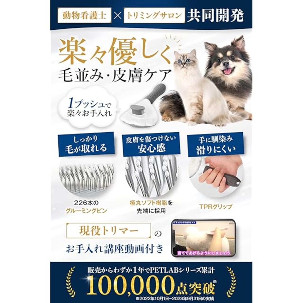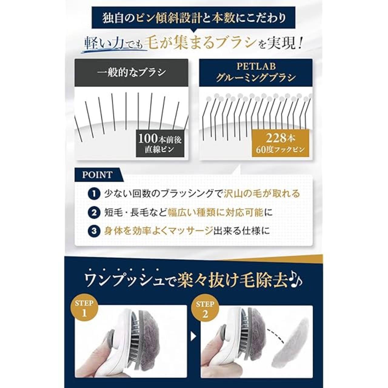 ✅【ワンプッシュでブラシ本体をお手入れできる楽々仕様】PETLABブラシでお使いいただている方からご好評を賜っている1つのポイントとして「ブラシに溜まった毛をワンプッシュでお掃除できる」というものがあります。こまめにブラッシングしてあげて欲しいからこそ、飼い主様のご負担をなるべく少なく出来るよう設計いたしました。