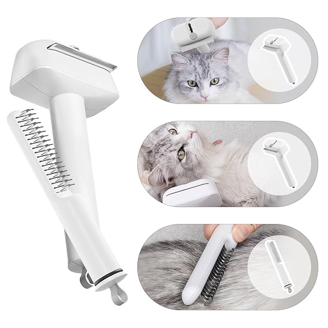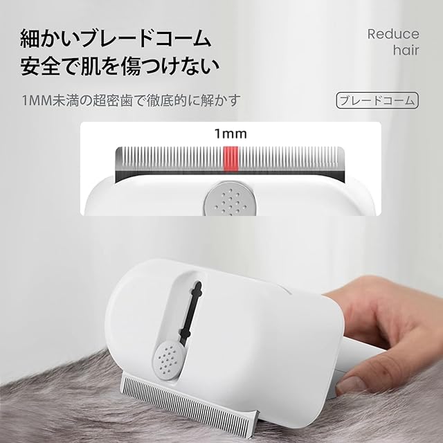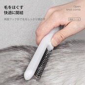 【使用方法】1.製品上部の丸いボタンを押しながら両側にスライドすると、抜け毛取りブラシと針のビーズブラシが現れます。2.製品下部の引き手を引き出すと、結び目解消ブラシが出てきます。3.初めて使用する際は、毛の流れに沿ってゆっくりとブラッシングしてください。このペット用ブラシはすべての猫と犬の品種に適しています。