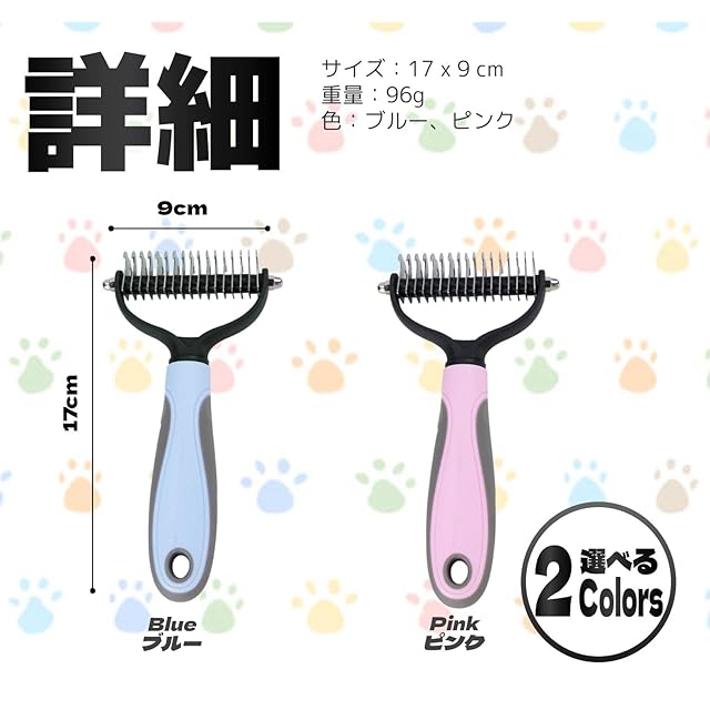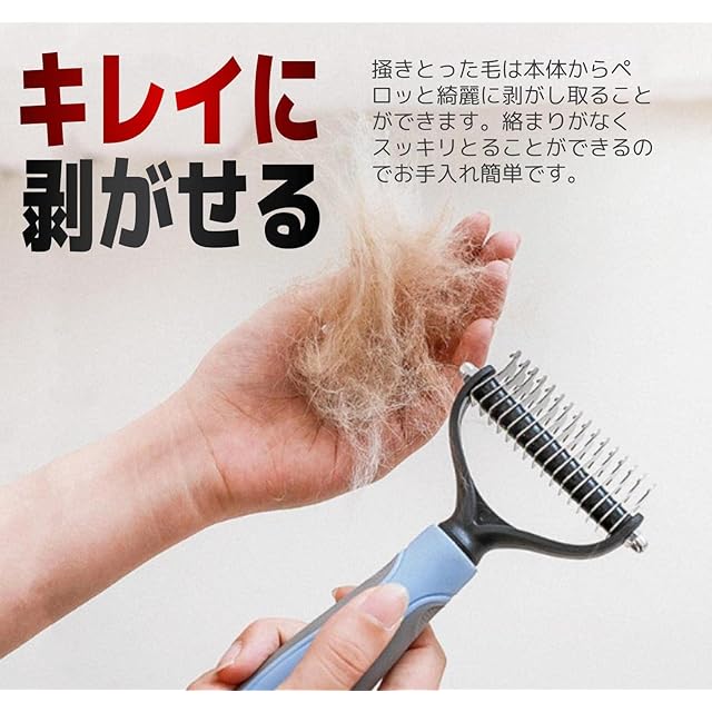 【両面で使える】前面だけでなく背面にも刃がついているので、片方が毛でいっぱいになった場合でも、くるっと持ち変えるだけで継続して毛を取ることができます。丸みを帯びた刃先がペットにストレスを感じさせません。 【キレイに剥がせる】掻きとった毛は本体からペロッと綺麗に剥がし取ることができます。絡まりがなくスッキリとることができるのでお手入れ簡単です。 【滑りにくく持ちやすい】持ちて部分は滑り止め加工がされており、片手でも快適に作業ができます。また人間工学に基づいた流線の形になっているため手によくフィットし、より楽にコーミングが可能です。