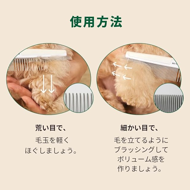【両目金】半分は荒い目に、半分は細かい目になっているので、中毛、長毛の犬猫通用ペットブラシで、トリミング、抜け毛取り、グルーミングなど様々なシーンで 大活躍します。