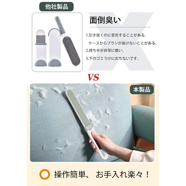 【両面ブラシ】両面ブラシ設計どちらの面も使用できるので、より多くのほこりが取れます。片面ブラシの 2 倍の速さで毛や糸くずを取り除きます。無限にほこりを取り続けられるブラシです。猫や犬などのペットがよく滞在する場所(ソファー、犬/猫ベット、 キャットタワー、布団、カーペット)の清掃に大活躍!