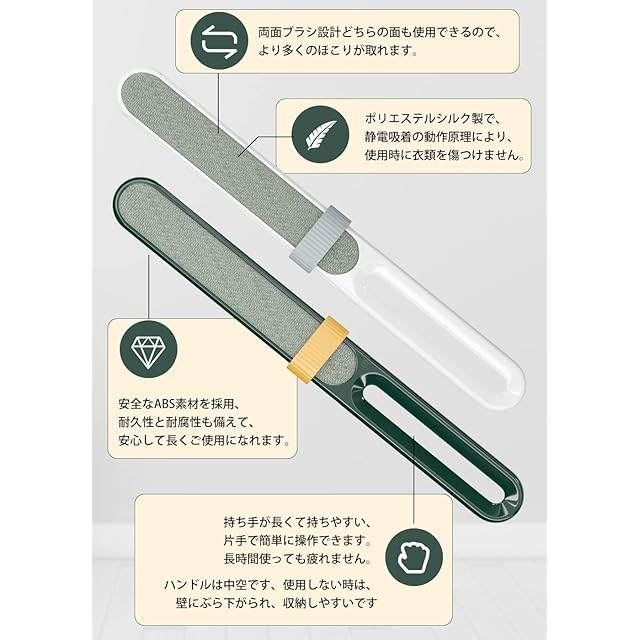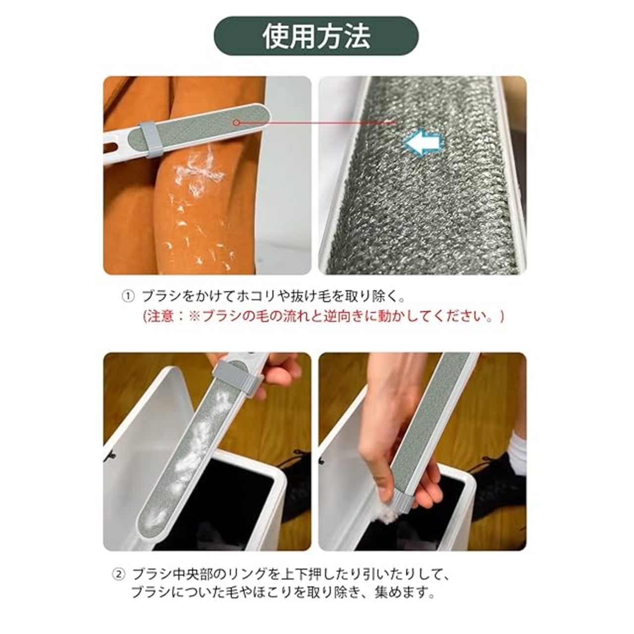 【使用便利】掃除が終わったら、ブラシ中央部のリングを上下押したり引いたりして、ブラシについた毛やほこりを取り除き、集めます、お手入れ楽々です。持ち手が長くて持ちやすい、片手で簡単に操作できます。長時間使っても疲れません。ハンドルは中空です、使用しない時は、壁にぶら下がられ、収納しやすいです。