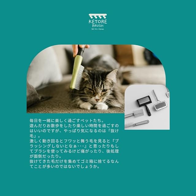 いつも撫でているペットからモコッと現れる抜け毛。「またこの時期がきたか」とブラシで取ったりコロコロで抜け毛を取ったりと大変なことばかり。 KETORE BRUSHはボタン1つでブラシを出し入れできてゴミ捨ても簡単なペット用ブラシです。 ブラシの先端は丸く加工されていますので、地肌を傷つけにくく、ブラシの面積も広いのであっというまに抜け毛が取れて、ゴミ箱の上でボタンを押すだけで取った抜け毛を捨てることができます。