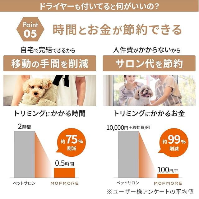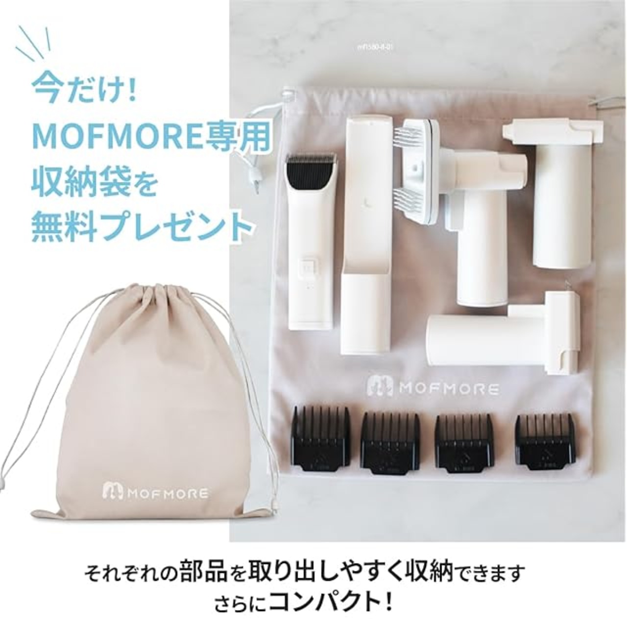 【 ペットの毛を舞わせない、新しいグルーミング体験 】 MOFMOREのグルーミング掃除機は、バリカンと掃除機を一体化出来るので刈った後の毛を吸い取ってトリミング後の掃除が楽になります。 付属のブラッシングアタッチメントに変えることで、毛や体の表面についたホコリなどを吸引できるペット用多機能ケア家電です。 ドライヤー・掃除機・バリカンの機能が1台に詰まっているから、お風呂上がりのケアやトリミングがこれ一台で完結します。