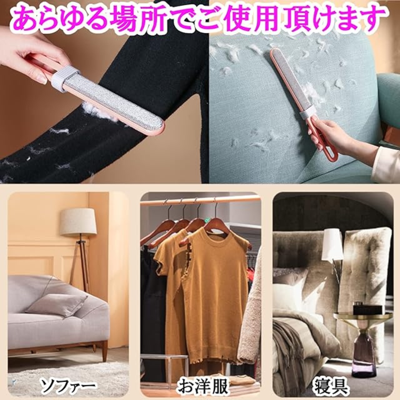 【らくらくお掃除】 ペットの毛やホコリを一掃するための便利なほこり取りブラシです。両面ブラシでどちらの面も使え、片手で簡単に操作できます。安全なABS素材とポリエステルシルク製で、衣類や生地にも優しく掃除できます。