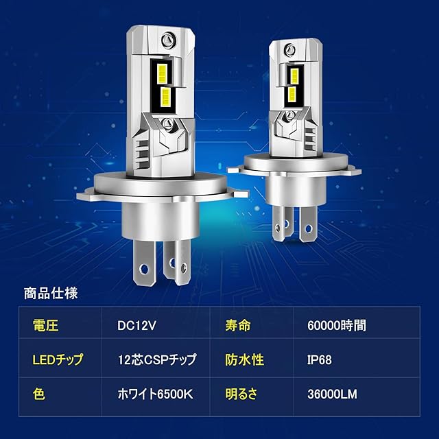 商品名:TORAKIA H4 LED ヘッドライト 車検対応 爆光26000LM 8倍明るさアップ ファンレス ハロゲンより小さい 6500Kホワイト CSP LEDチップ搭載 12V キャンセラー内蔵 IP68防水
