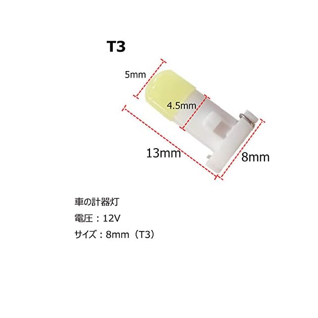 仕様: 電圧ワット数: 12V DC LEDカラー:ホワイト タイプ:ウェッジ ソケットの種類: T3 . ベースの長さ:8mm 適用:計器盤のパネル、ダッシュボードのゲージ、室温調節ライトなどに最適です。