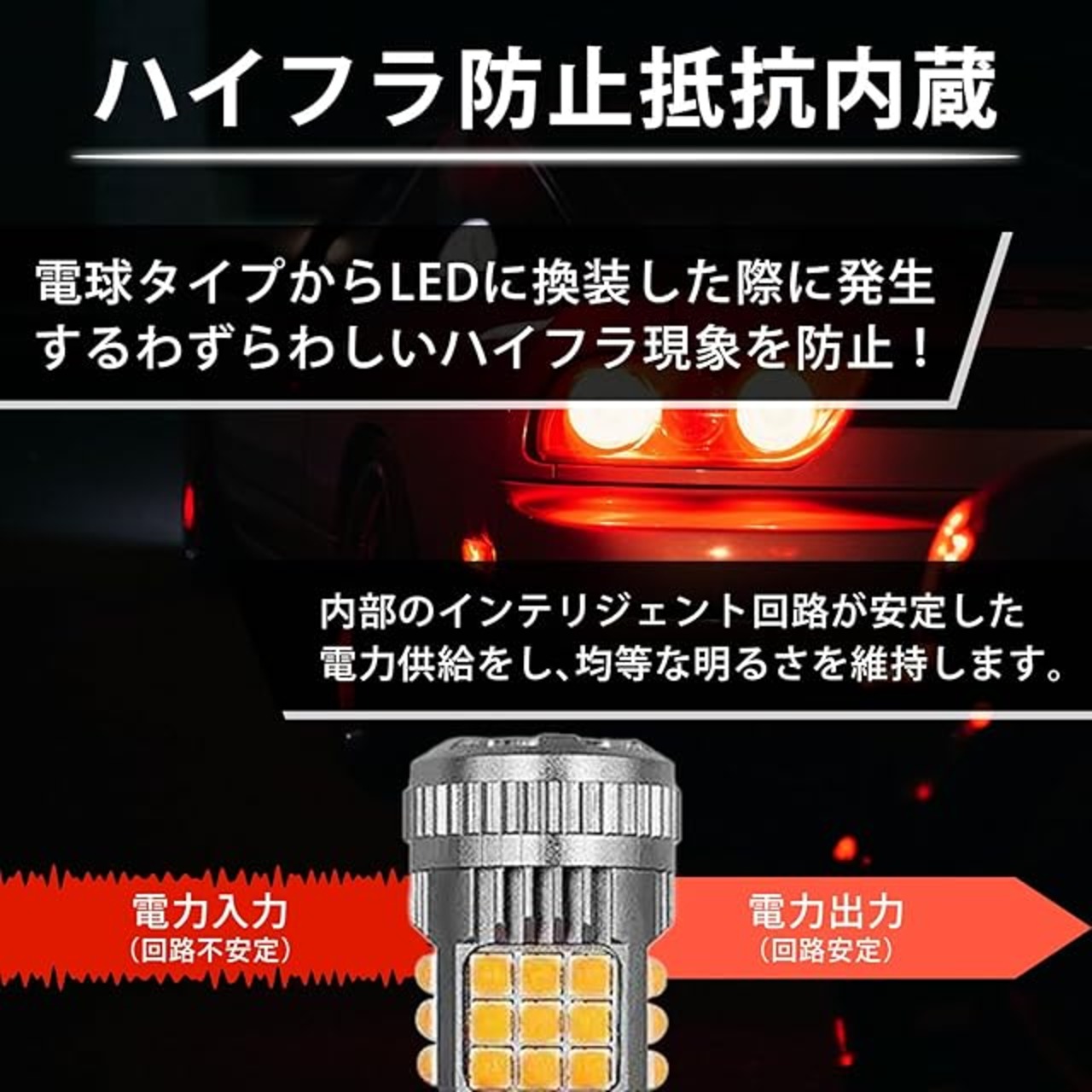 ・T20タイプでピンチ部違いのLEDウインカーバルブです。高性能LEDチップを全面に搭載し、明るく理想的なアンバー色を実現しました。リフレクターの拡散性も良く、視認性も抜群です。さらに、ステルス仕様なので、消灯時にはバルブの存在感がなくなり、すっきりとしたスタイリッシュな見た目を保ちます。・キャンセラー内蔵設計により、ハイフラ防止対策のための面倒な追加作業は一切不要で、純正球を交換するだけでLED化が完了します。分岐タップや配線の加工が不要なので、車両の純正配線を傷つける心配もありません。・進化したアルミヒートシンクと航空用アルミ合金素材を採用し、耐熱性と放熱性が大幅に向上しました。また、LEDなので一般的な使用で50000時間以上の長寿命を実現しています。・LEDには極性があります。もし点灯しないときは、向きを180度変えて再度取り付けてみてください。・【商品詳細】商品名:t20 ピンチ部違い led ウインカー ハイフラ防止 アンバー ledウインカーバルブ バルブ形状 : T20 シングル (7440)、消費電力:20 - 25W、電圧:DC12V、発光色:アンバー(オレンジ)、色温度 : 6500K、光束 : 5000ルーメン、動作環境:-40℃~+80℃、使用寿命:50000時間以上、サイズ : 全長約55mm×幅約20mm