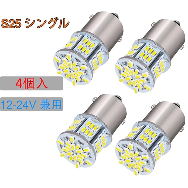 【S25シングル LED ホワイト 4個】高発光効率の3014LED素子54個搭載、360°全方位照射でき、DC 12-24V車用バルブ4個セット。