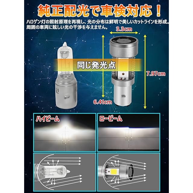 ✅【車検対応&正確な配光設計】バイク ヘッドライト led ba20d バルブ発光点を純正ハロゲンと一致させた精密設計により、眩惑光を抑えた正しい光軸を実現。対向車や歩行者への眩しさを軽減し、安心で快適なナイトドライブが可能。日本国内の車検基準にも対応しているため、取り付け後も安心してご使用いただけます。