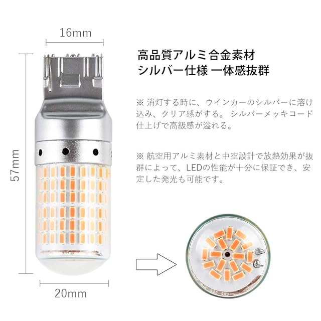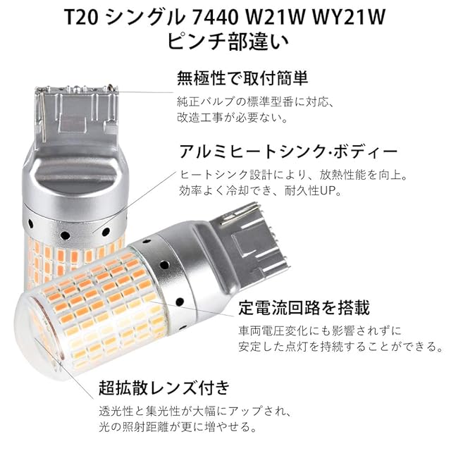 <b>◆ ハイフラ防止機能内蔵</b><br> 通常LEDは純正球よりも消費電力が低いため、玉切れを起こしたと認識し誤作動を起こしてしまい、ハイフラ状態になり、別途ハイフラ対策をする必要があるが、本製品は、小型のハイフラ抵抗をバルブ内に内蔵しているので、面倒なハイフラ対策・加工は必要ない。<br> <br> <b>◆ シルバー仕様 一体感抜群</b><br> 消灯する時に、ウインカーのシルバーに溶け込み、クリア感がする。シルバーメッキコード仕上げで高級感が溢れる。<br> <br> <b>◆ 高輝度&全方位照射</b><br> 高輝度美光照射の3014SMD LED素子144連搭載。超拡散レンズ(全カバー)が付くため、光線が集中でき、ついに照射距離も増やせる。それに、360°全面的に照射でき、昼間の環境でも十分の認知できる明るさと拡散性を備える。<br> <br> <b>◆ 放熱効果&耐久性抜群</b><br> 航空用アルミ素材と中空設計で放熱効果抜群の為、LEDの性能を十分確保でき安定した発光が可能である。また、バルブやLEDチップ・抵抗から発生する熱を効率良く逃し、寿命を最大限伸ばすことができる。<br> <br> <b>◆ 商品仕様</b><br> · 口金タイプ:T20 シングル 7440 W21W WY21W ピンチ部違い<br> · 発光色:アンバー<br> · LEDチップ:3014SMD<br> · LEDチップ数:144連<br> · 対応電圧:DC 12V<br> · 電流:1.75A<br> · 消費電力:21W<br> · 極性:無極性<br> · サイズ(約):全長57mm 最大直径20mm 差込口幅16mm<br> <br> <b>※ご注意:</b><br> ①ご注文する前に必ずこのバルブの正しい用途を確認してください。<br> ②本製品は、ウインカーランプ専用です。ウインカーランプ本来の点滅状態を前提として設計されておりますので、常時点灯させるランプには使用しないでください。<br> ③他の個所でもLED化している場合や、一部の車種では前後両方ともLEDにした場合など、ハイフラ・ゴースト点灯防止機能が働かない場合がございます。その際は、別途ハイフラ抵抗器をご用意願います。<br> ④エンジン始動時に純正球では点滅しない程度の微弱電流を流し球切れチェックを行う車両に関して、消費電力が少ないLED球は車両チェックを行っている間の数秒間、微弱電力に反応し数回点滅します。製品には異常ございませんので予めご了承ください。<br> ⑤全ての車種において動作は出来ません。本製品は輸入車特有の球切れ警告表示を回避する製品になりますが、稀に一部車両で球切れ警告灯が点灯したり、LEDバルブの点滅・不点灯等正常に点灯しない場合がございます。弊店はご注文日より100日品質ありますので、万が一商品が問題あるなら、ご遠慮なく「店名」-「質問する」の手順でクリックして連絡ください。24時間以内返答で、新品交換や返·金などの解決策がご提供頂します。