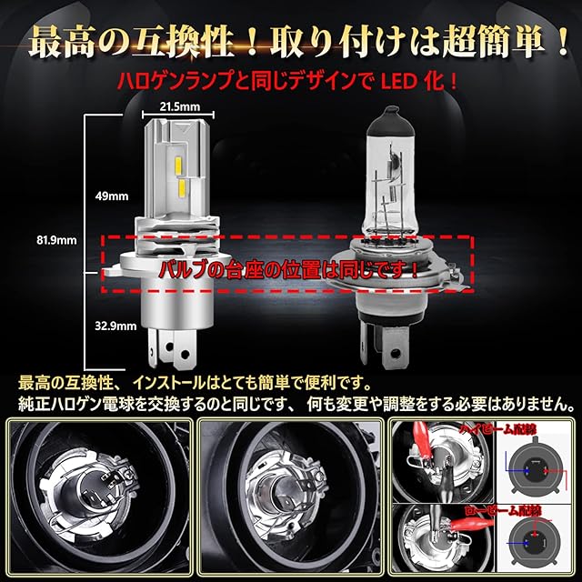 【取付簡単&抜群の耐久性】コンパクトな一体型デザインで純正ハロゲンランプを完璧に差し替えます。純正バルブのサイズ、取り付けは簡単です。ダメージのないインストールを一歩で完了する。純正ハロゲン電球と同じ発光点に、ブランドCREE社製LEDチップを採用して。高輝度1600ルーメンLED電球は純正ハロゲン電球は視認性を大幅に向上させた!純正ハロゲン電球に比べ、輝度が300%もアップ、省エネは50%。省電力耐久性抜群の逸品です。純正ハロゲンランプのLED化を体験するには最適です!