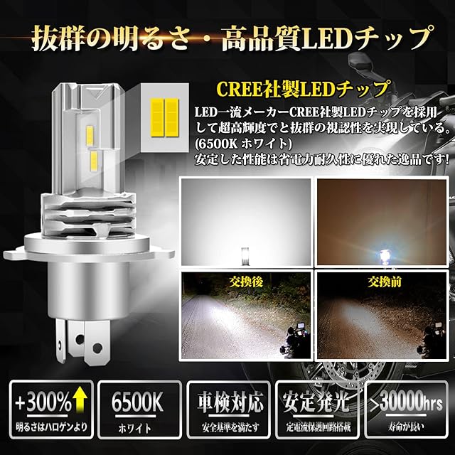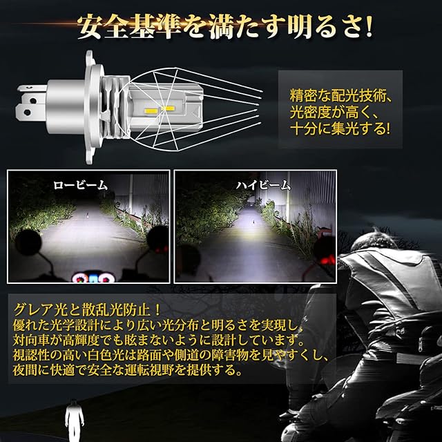 【安定した性能】バイク用 led バルブH4 は高性能定電流保護回路搭載。LEDの明るさを一定に保ち安定して動作させる。LEDの輝度を安定させて動作させ、LEDチップの寿命を延長させる。数秒で瞬間的に起働し、点灯することができる。性能安定のための最適な選択を求める。