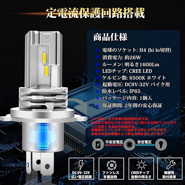 【最高の互換性!安心してお買い求めください!】無極性設計H4 ledバルブ、DC12V/24V バイク用 LED ヘッドライト。【2年間の安心】期間内故障が発生した場合、私たちに連絡してください。無償で交換可能です。【商品スペック】 型番:H4 Hi Lo / LEDチップ:CREE LED /ケルビン数:6500K ホワイト / ワット数(片方):約26W /ルーメン:明るさ1600Lm(片方)/ 照射角度:360度発光 / 電圧:DC9V-32V/ 動作環境:-40℃~+80℃ / 使用寿命:30000時間 / セット内容:バイク H4 ledヘッドライト 1個入
