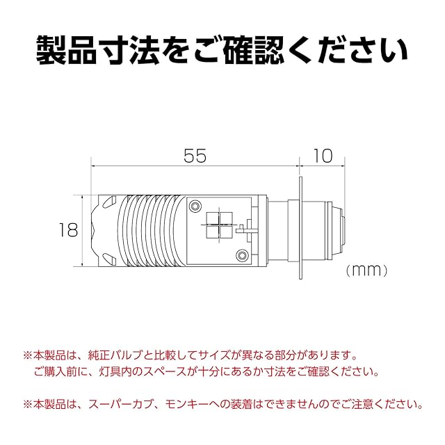 ※適合のご注意:本製品は、純正バルブと比較してサイズが異なる部分があります。ご購入前に、灯具内のスペースが十分にあるか寸法をご確認ください。スーパーカブ、モンキーへの装着はできませんのでご注意ください。