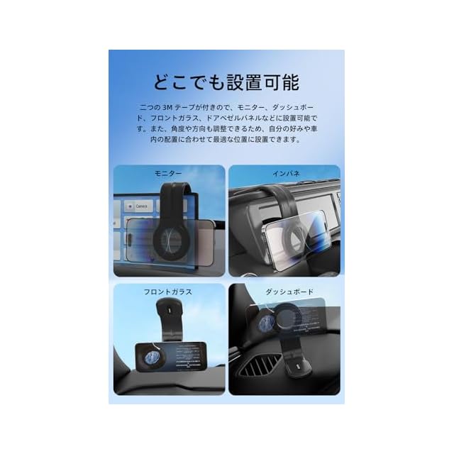 幅広い互換性:テープを使用するため、車内のダッシュボードやモニターなど平らな表面に取り付けることができます。運転の習慣により適合な位置を選んできます。また、Magsafe対応のスマホ(iPhone 12シリーズ以降)はホルダーを置くで直接に吸着可能だけではなく、付属のメタルプレ一トまたはMagsafeアクセサリ一を利用して、Magsafe機能ないのAndroidスマホも使用可能です。※Magsafeスマホケースを使用した場合は付属のメタルプレ一トを使用しないでください。