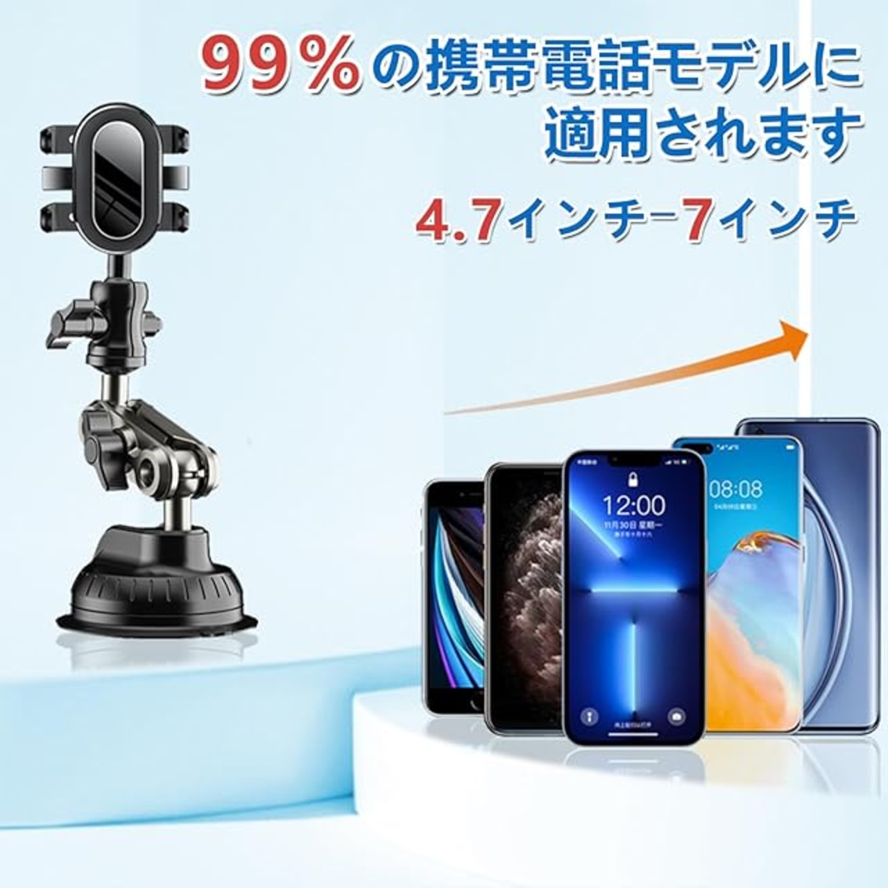 【99%モデルに適用】 この車載電話ホルダーのクランプアームの伸長範囲は非常に大きく、4.7〜7インチのスマートフォンと互換性があるため、iPhoneでもAndroidでも、ほとんどのモデルの携帯電話をホルダーに取り付けることができます。