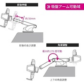 【対応スマホサイズ】幅:約55~88mm/厚み:約20mmまで/ホルダー部耐荷重:約250g以下【セット内容】ホルダー本体×1/ロングアーム吸盤×1(吸盤部直径約64mm)/吸盤補助シート×1(直径約73mm)※基本的に吸盤のみで設置可能ですが、設置場所の状況により吸盤補助シートをご利用ください。/取扱説明書