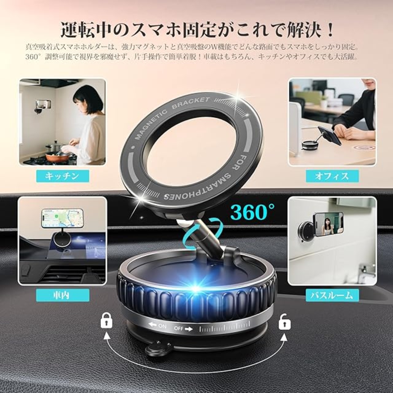 【強力磁石、マグセーフ非対応も安心】マグネットスマホホルダーでどのようなスマホも安定固定。マグセーフ対応・非対応問わず、車 スマホホルダーとして人気の機能性。吸着式スマホホルダーでスマホを安全にホールド。