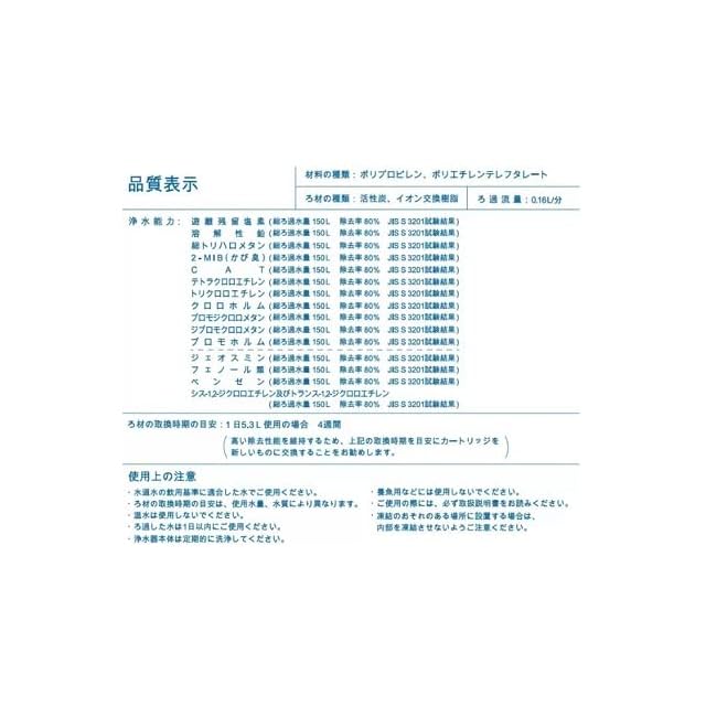 商品の特徴 <br /> 浄水能力15項目除去 <br /> ろ材の取り換え時期の目安:1日3.5L使用の場合 8週間 <br /> 水道水の飲用基準に適合した水でご使用ください <br /> 温水は使用しないでください <br /> <br /> 商品の詳細 <br /> ウォーターフィルターカートリッジは、一時硬度 (水アカの原因)、味や匂いに影響を及ぼす不純物 (塩素など)、 <br /> また鉛、銅等の水道水に含まれている可能性のある重金属類を減少させ、紅茶やコーヒーの風味がアップします。 <br /> BRITA Maxtra+のポットに使えます。
