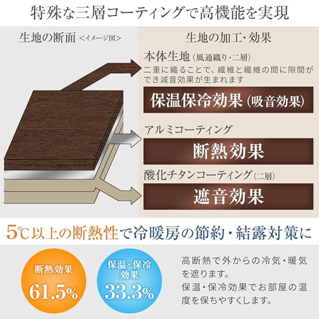 特殊コーティングにより、遮光性・断熱性が非常に優れた、遮音性にも期待できるカーテンです。厚みのある風通織りのドレープ地に特殊なコーティングを施すことで、日差し・視線を100%カットするだけでなく、優れた断熱・保温保冷効果、さらには吸音・遮音効果のある生地に仕上げました。