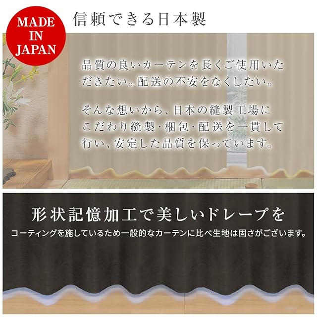 組成:ポリエステル100%,裏地:特殊三層コーティング 水丸洗いOK!! 日本製 ※幅サイズ、125cm・150cm・200cmの商品については必ず生地と生地のつなぎ目が入ります(幅継ぎ) 幅継ぎについて・・・こちらの商品は幅150cmの生地を用いて1.5倍ヒダで製作しているため、幅が100cmを超えるカーテンを製作する際には2枚の生地を継いでの製作となり、生地と生地のつなぎ目が入りますこと、予めご了承のうえご検討をお願い致します。