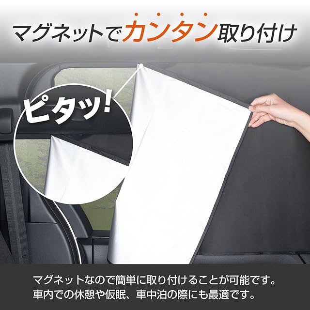 高い遮光率で外からの光や視線もシャットアウト!車中泊やお子様の着替えなどのプライバシーの保護、休憩や駐車時の車内の温度上昇による熱中症対策にも役立ちます。