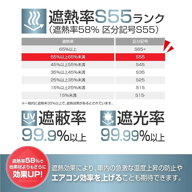 チタン銀コーティングで遮熱効果は58%以上、紫外線カット率99.9%以上、遮光効果99.99%以上で車内を保護します。
