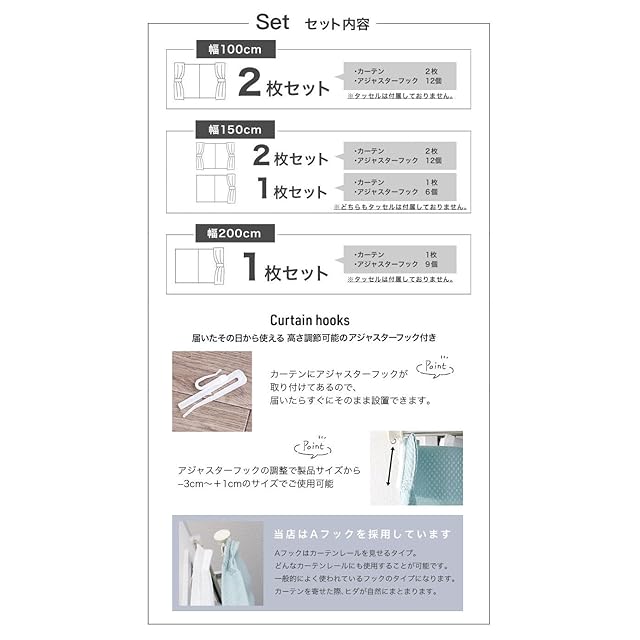 【付属品】高さ調節可能なアジャスターフック付き(製品1枚に付き8個)。タッセルは同封されておりません。