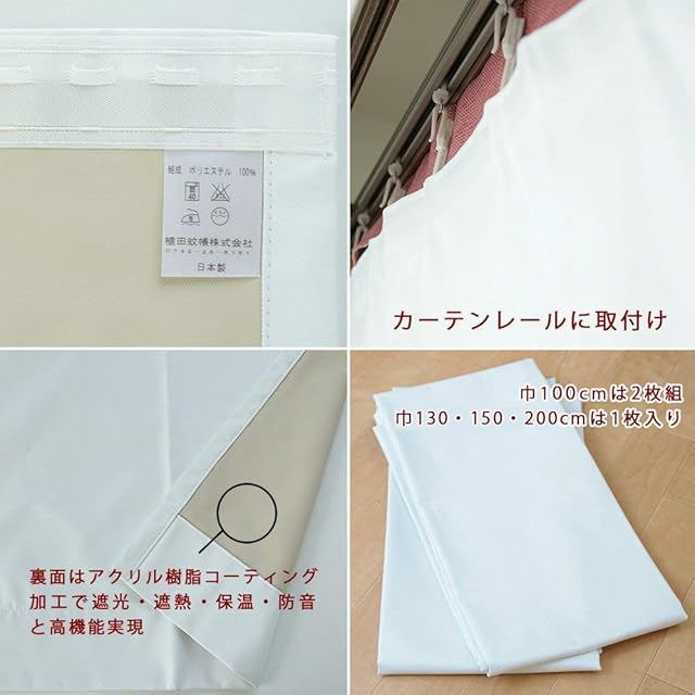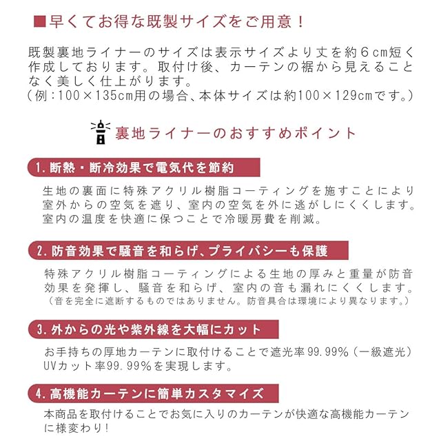 【既製・特急】お手持ちのカーテンに簡単取り付けでお気に入りのカーテンが<遮熱・断熱・1級遮光・防音・UVカット>の高機能カーテン様変わり!窓からの熱や冷気の進入を防ぎ、部屋の温度を一定に保ちます。 ■本体実寸:約幅130×丈194cm 1枚入 日本製 ■幅130×丈200cmのカーテン用裏地 ■表地:ポリエステル100%・裏面:アクリル樹脂コーティング ■付属品:取り付け方説明書 ■機能性:遮熱/断熱/1級遮光/防音/UVカット