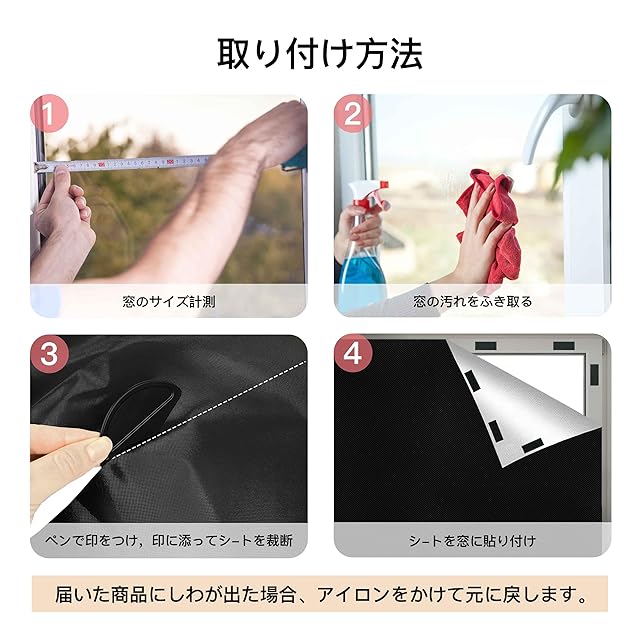 選べるサイズと簡単カット. サイズは4種類(1m×1.46m、2m×1.46m、3m×1.46m、4m×1.46m)から選べ、ご家庭の窓サイズに合わせて自由にカット可能。セット内容にはカーテン生地1枚(4サイズより選択可)、マジックテープ20枚、丸型両面テープ20枚、カッター1個が含まれており、ご購入後すぐに設置が可能です。