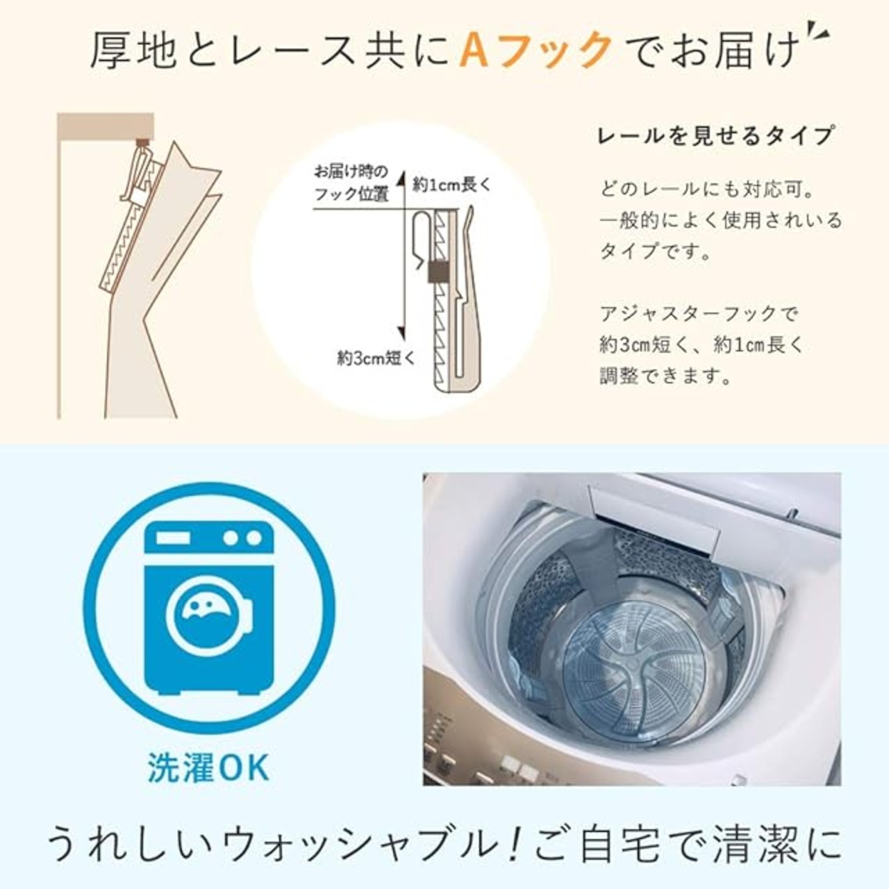 【ウォッシャブル】ドレープ、レースともにポリエステル100%。ネットに入れて弱水流にて、ご自宅の洗濯機でのお手入れ可能です。