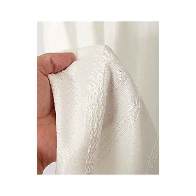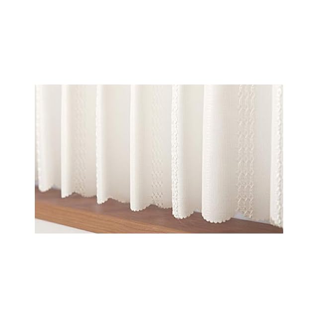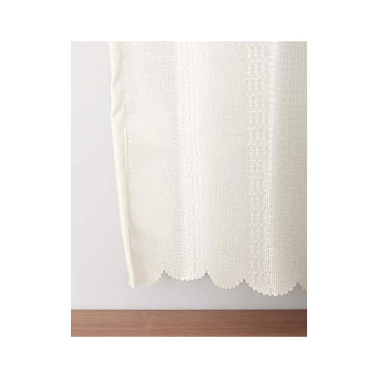 UVカット率92.4% 巾が大きいワイドサイズのミラーカフェカーテンです。大きく広げて掛けてもよし、ヒダたっぷりで掛けてもよし。3本鎖のように並んだストライプ(幅約1.5cm)のデザインです。表の地の生地は光沢はなく、ストライプ部分は光る糸を使っているので、 アクセントとしての存在感があります。色はホワイト表記ですが、ややオフホワイトに 近い白です。ふだん見慣れたレースカーテンと比べると、かなり地厚でゴッツイ生地になります。断熱性も高いので、気になる小窓に取り付けて冷暖房効果アップ。台所や玄関などの小窓におすすめ。※お部屋の中からも外が見えにくくなりますので、ご注意下さい。