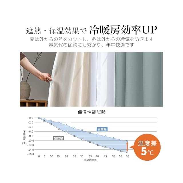 【冷暖房効率のアップで省エネ】完全遮光で光だけでなく熱も遮ってくれます。窓ガラスの温度をシャットアウトするから、お部屋の快適な空気も守ります。暑い夏、ジリジリした熱の侵入を防いでお部屋の温度上昇を抑え&お部屋の涼しい空気をキープして快適に。冷房効率もアップして省エネにもなるので、お財布や環境にも優しくてとっても嬉しい機能なんです。カーテンのスキマから入り込む 空気・光漏れ にはレールの横を「リターンフック」で覆うことで気密性が高まり、断熱性・保冷性などの省エネ効果もあります。