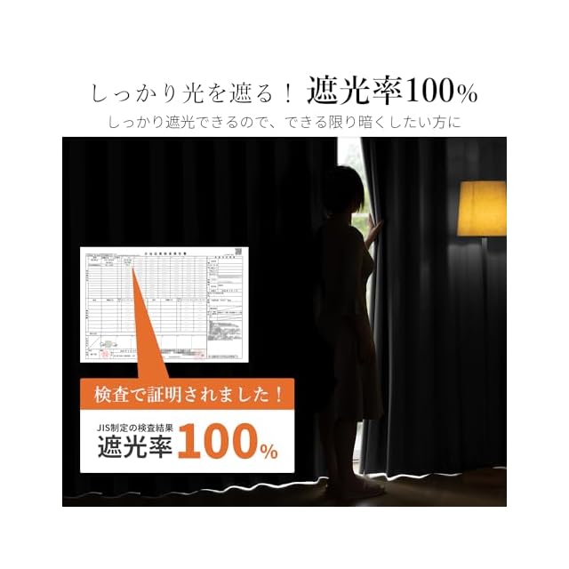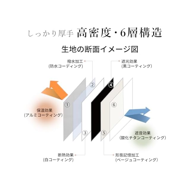 【完全遮光カーテン】厚手6層構造・高密度で高い遮光率を実現。日差しの強い窓でもしっかりと遮光できるので、光が透けにくく、日中に降り注ぐ強い日差しもシャットアウト!夜勤者の昼夜逆転睡眠・光敏感なお子様の昼寝・ホームシアターに最適※同じ遮光率でも太陽光の強さやカーテン色により遮光効果が異なります。淡色は光が透けやすい性質があるため、より高い遮光性を求める方は濃色をお選び下さい。