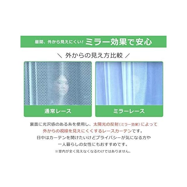 機能:太陽光の反射効果で、日中外から部屋の中が見えにくいレースカーテンです。(曇りの日や夜は高い効果が期待できません)