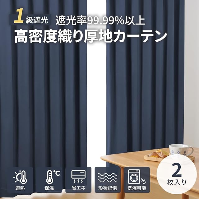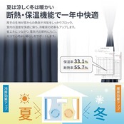 【断熱保温・省エネ】厚手の高密度生地が窓からの熱気や冷気をしっかり遮断し、夏は涼しく冬は暖かく快適に保ちます。室内の温度を一定に保つことで冷暖房の効率もアップし、電気代の節約にもつながります。エコで心地よい暮らしをサポートします。