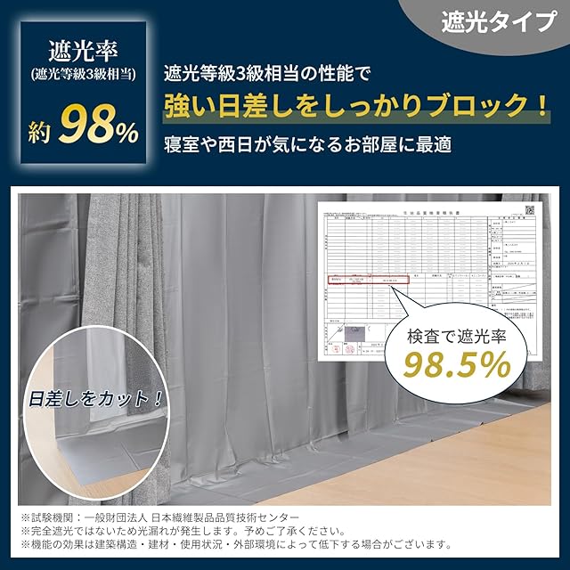 【遮光率約98%】強い日差しをしっかりブロックできる遮光等級3級相当の性能。朝日がまぶしい寝室や、西日が差し込むお部屋に最適。必要な光をコントロールして、より快適な空間に。