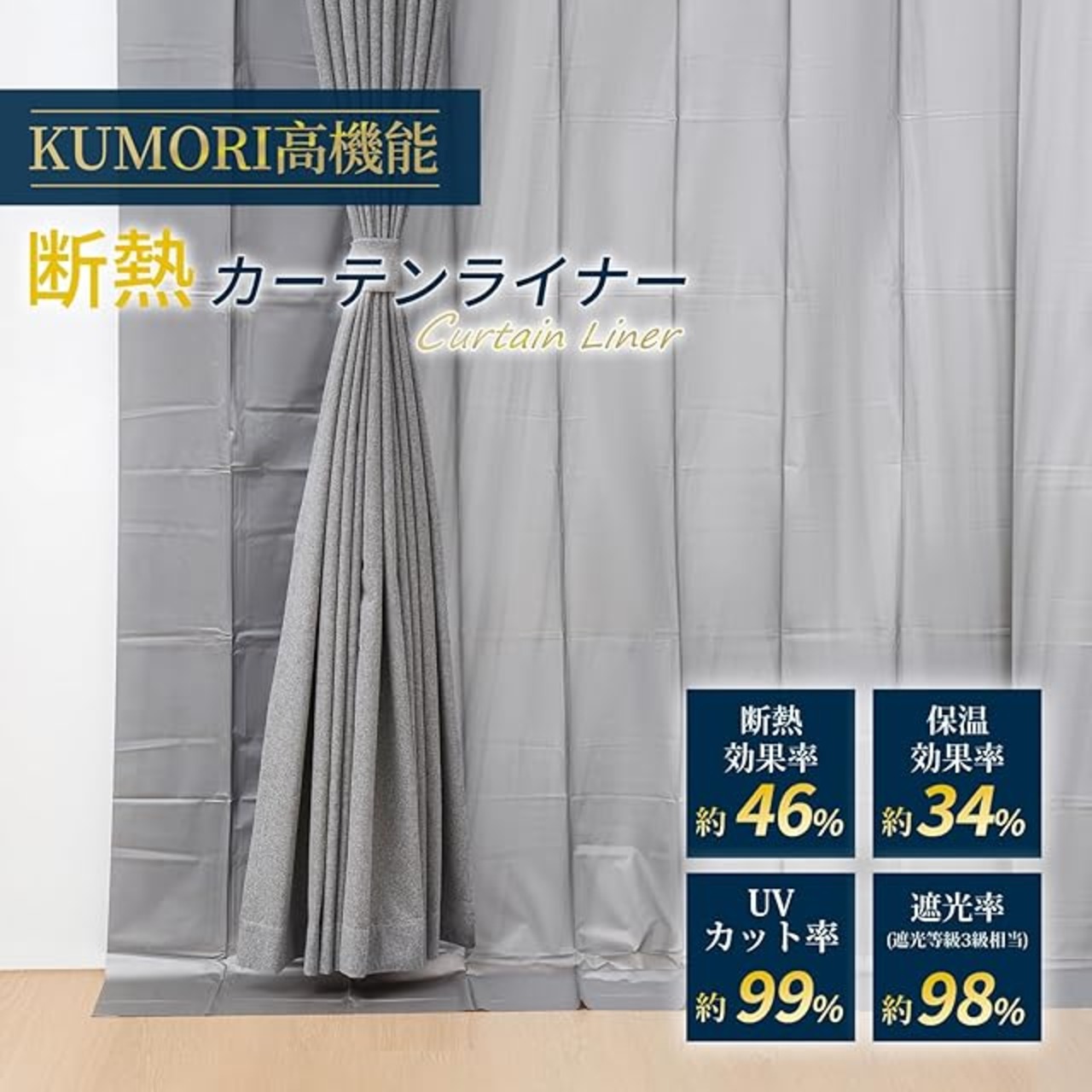 商品名:クモリ(Kumori) 省エネ カーテンライナー 夏涼しく 冬あったかい 冷暖房効率アップ 遮光タイプ UVカット率99% 節電 取り付け簡単 フック付きで届いたらすぐ使える 長さを自由にカット可能 断熱カーテンライナー 窓 遮熱カーテン オールシーズン 夏冬兼用(約幅100cm×丈200cm 2枚入・グレー)