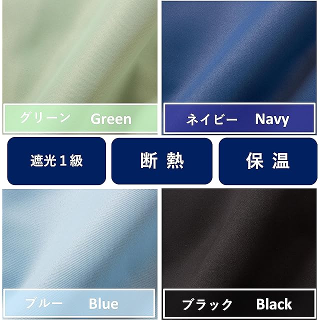 【生地特徴】 遮光1級生地(遮光率99.99%)を使用。夏場の断熱効果(44.5%,10.5℃)冬場の保温効果(32.8%,4.5℃)。