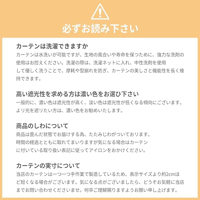 注意事项: 既成 カーテン手作りのため、2cmの誤差があるかもしれません、ご了承ください。カーテンは輸送のために折りたたまれているので、しわが現れます。 それはアイロンで解決できます。生産過程でカーテンにシミができることがあります、手洗いや洗濯機で洗うことができます。モニターや室内環境が異なるため、色や明るさなどが実物と異なります。 ご不明な点がございましたら、お気軽にお問い合わせください