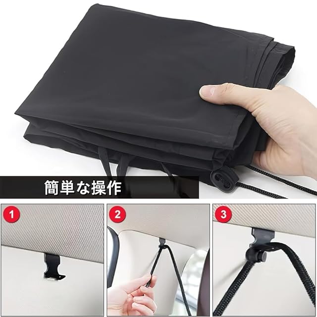 【使いやすさ】車内のピラー部分の隙間にフックをかけるだけで装着完了。カーテンを小さく束ねられる固定紐付きで、使わない時はコンパクトにまとめておけます。乗降時や運転の妨げにならず、解くだけで使いたい時に使えて便利です。