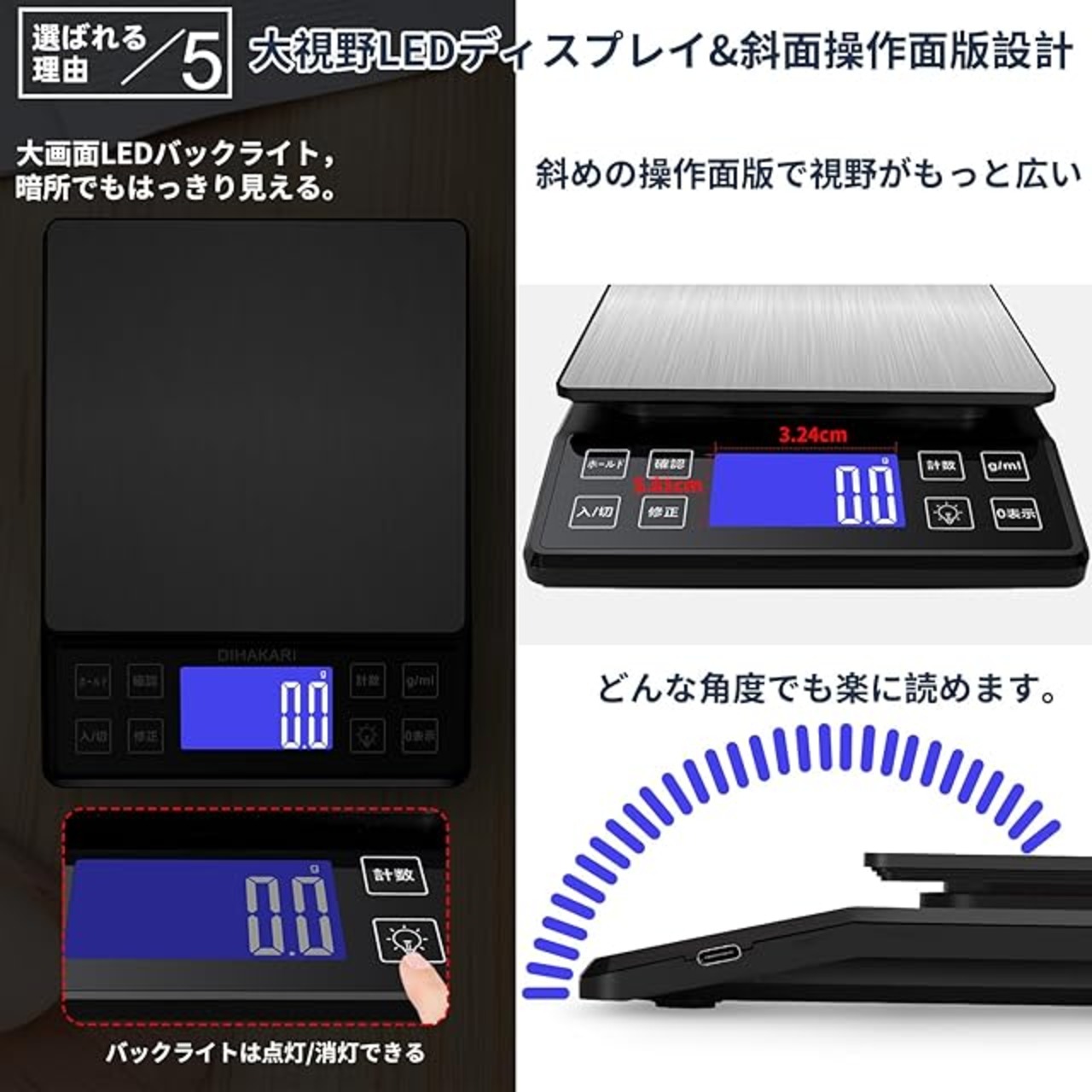 "この電子スケールは、家庭用からキッチンでの計量に最適なデジタル秤です。最大5000gまでの計量に対応し、0.1g単位の高精度で測定が可能です。さらに、g/mlの簡単な切り替え機能を搭載しており、液体の計量にも便利です。日本の規定に準拠した分度量程を採用しており、正確で信頼性の高い計量を実現します。<br> 製品には校正砝码が付属しており、手動で簡単に校正が可能です。また、計量後の重さを手動でロックすることができ、計量結果を確実に保持できます。使いやすさを追求したデジタルはかりは、操作ボタンが8つあり、シンプルで直感的な操作が可能です。背面には手にフィットする防滑凹槽があり、持ち運びも快適です。<br> 大きな秤面は視認性が高く、計量中のデータがはっきりと表示されます。さらに、傾斜した面板により、座っている状態でも計量結果が見やすく、広い視野を提供します。背面には便利な掛けフックがあり、収納も簡単です。また、防滑脚垫がついており、安定した計量が可能です。流れるようなデザインとスタイリッシュな外観が特徴で、どんなキッチンにも調和します。<br> この電子計りは、USB充電と電池の2つの電源方式をサポートしており、どちらの方法でも快適に使用できます。計量中にオートオフ機能が働き、一定時間後に自動的に電源が切れるため、無駄な電力消費を抑えます。また、計数機能も搭載しており、定量的な計量が必要な場合に便利です。<br> 付属のトレイは、計量物が滑り落ちるのを防ぎ、精密な計量をサポートします。料理やクッキングスケールとして、あらゆる用途に最適なこのデジタル秤は、キッチンでの使用にとどまらず、家庭内で幅広く活躍します。"