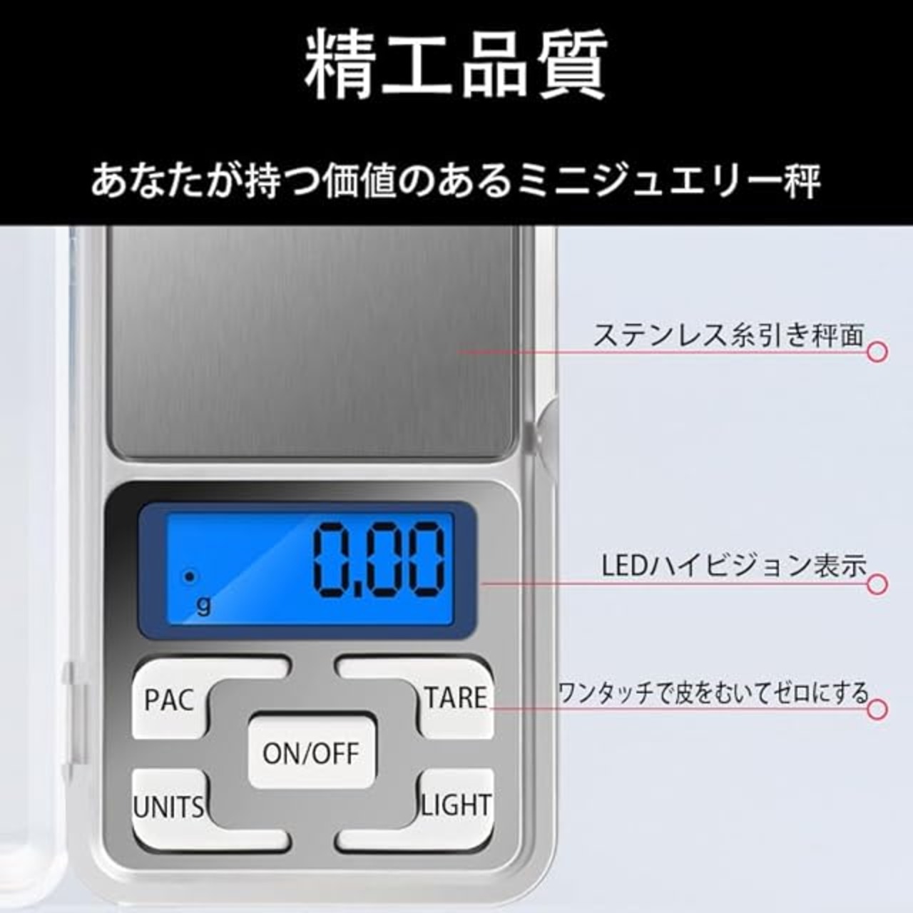 【持ち運びに便利】コンパクトでポケットに入れやすく、どこでも使える。<br><br><br>【精密計量】計量範囲は0.01 gから500 gで、計数機能は電子スケールで項目数を表示でき、正確な測定項目に役立つ。<br><br><br>【適用範囲が広い】日常生活の秤量、ジュエリー秤量、茶葉秤量、口紅製造など、一秤多用。<br><br><br>【多種の測定単位】単位のワンクリック変換は、異なる材料の秤量需要を満たし、交換したいなら交換し、好きなようにする。<br><br><br>【滑り止め設計】底部滑り止め設計、四角シリカゲル滑り止め台座はより安定している。<br><br><br>