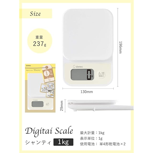 商品名:dretec(ドリテック) キッチンスケール デジタル 起動時間が速くてすぐにはかれる 1kg/1g単位 風袋引き 大画面 ホワイト