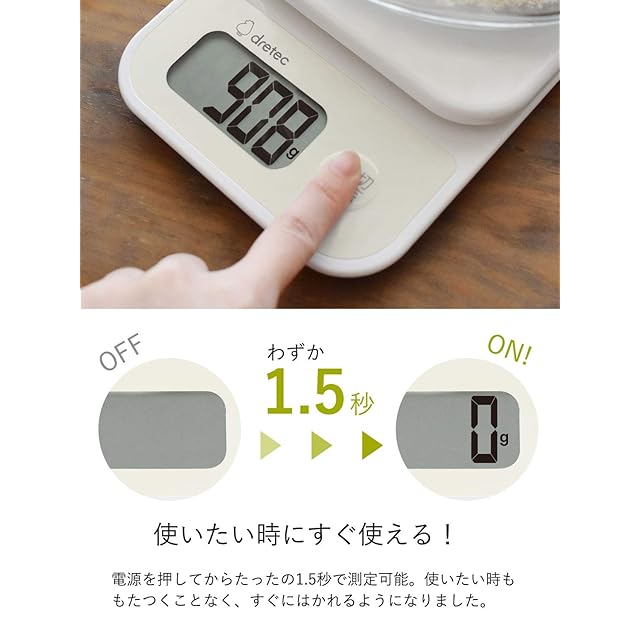 dretec(ドリテック) キッチンスケール デジタル 起動時間が速くてすぐにはかれる 1kg/1g単位 風袋引き 大画面 ホワイト